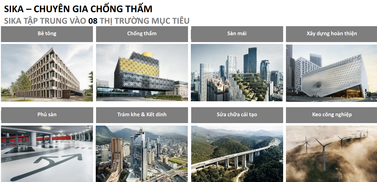 ▪ Sika Việt Nam chuyên sản xuất và cung cấp sản phẩm và giải pháp cho hầu hết các ứng dụng trong xây dựng và công nghiệp.