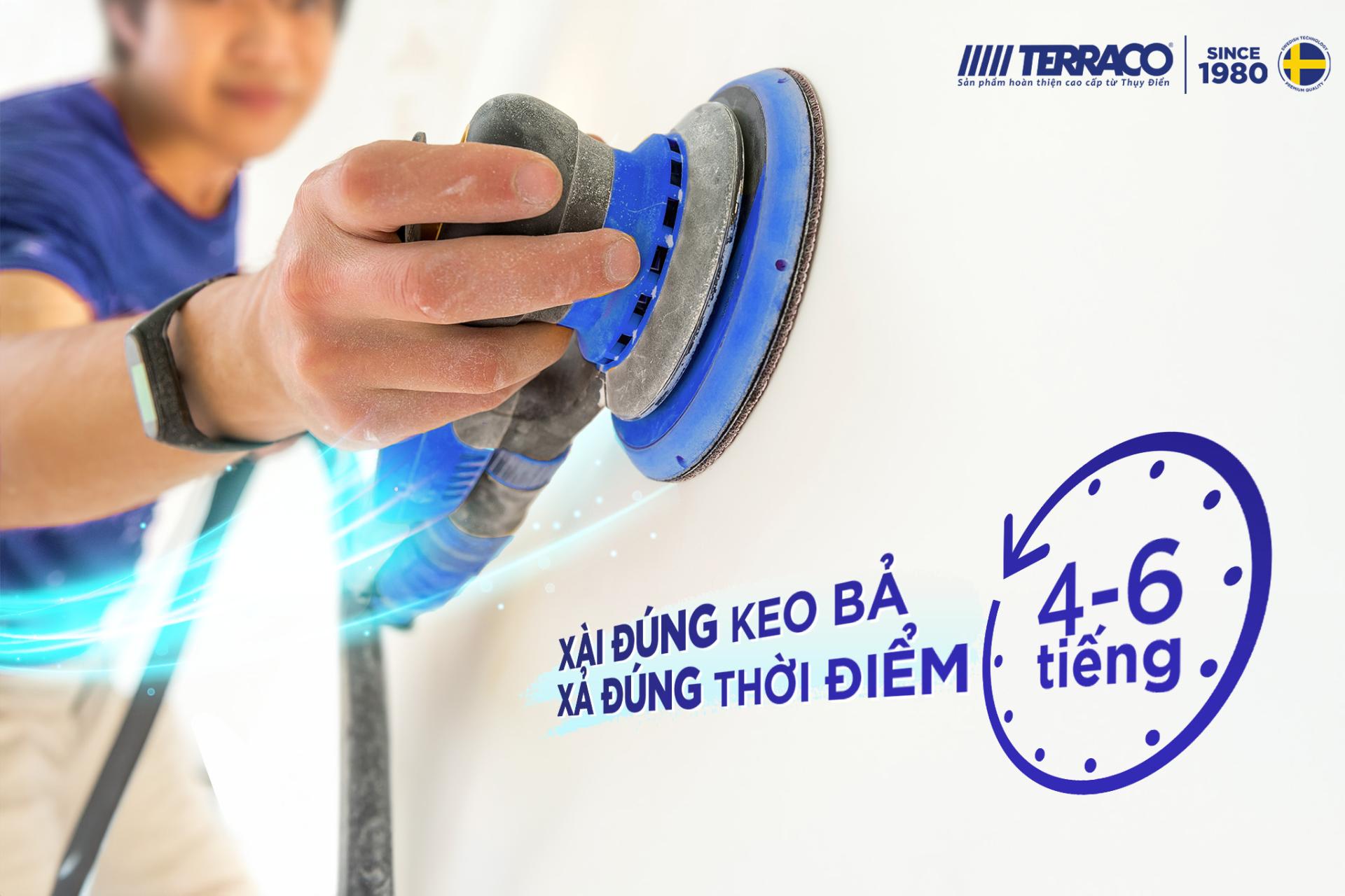 Không còn 24 tiếng chờ đợi để xả nhám Terraco mang đến 1 sự thay đổi với sản phẩm keo bả Handycoat với công nghệ cải tiến mới, rút ngắn thời gian chờ xả nhám chỉ còn 4-6 tiếng thay vì 24 tiếng như các loại bột bả thông thường.