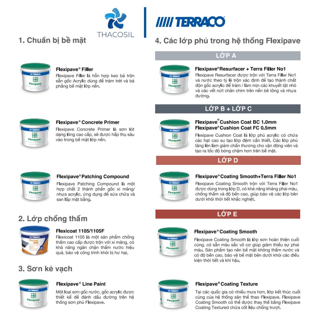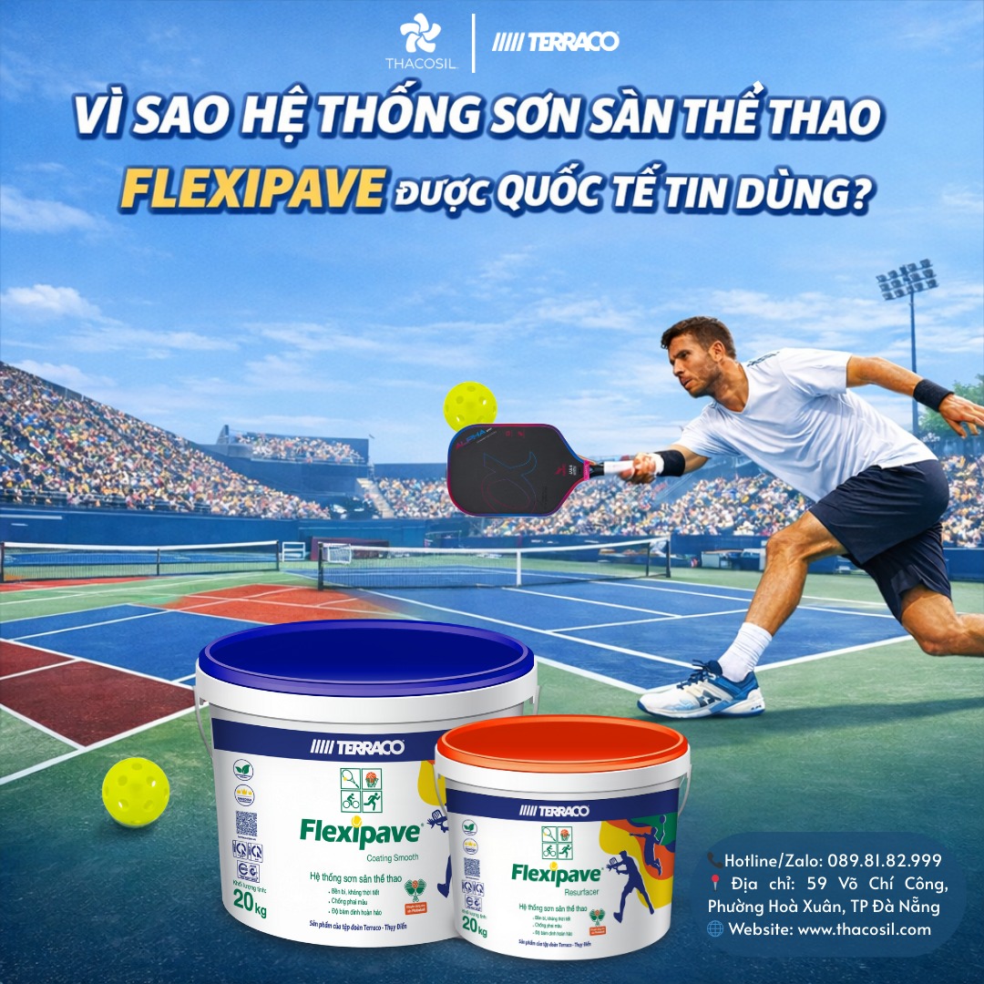 Trong số các hệ sơn sân thể thao đang được sử dụng rộng rãi hiện nay, hệ thống sơn sân thể thao Flexipave của Terraco là một trong những giải pháp được tin dùng trên nhiều quốc gia, đặc biệt cho các loại sân thể thao ngoài trời như sân tennis, sân pickleball, sân cầu lông, sân bóng chuyền và sân đa năng.